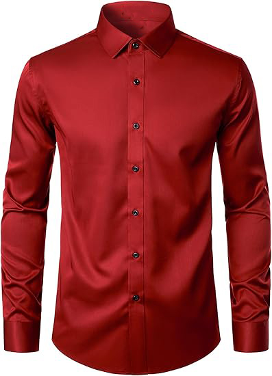 | Care: Machine wash,tumble dry or line dry,low temperature ironing Slightly Shiny Fabric:Like satin silk, this shirt has more shiny than cotton dress shirts. It is soft and comfortable to the touch, cool and smooth, beautiful and eye-catching, making it very suitable for weddings, balls, parties, and other events. If used in work or business occasions, it might be too shiny Slight Elasticity:Due to the fabric containing only 5% spandex, the elasticity is relatively weak. The elasticity of this shirt runs horizontally from left to right. Polyester-spandex blended fabric offers excellent stability,low shrinkage rate, durable Slim Fit:Compared to classic slim fit shirts, this shirt has longer sleeves and a slightly wider waist. If you prefer an extremely fitted look, we recommend choosing a smaller size Wrinkle-Free:Due to packaging reasons, the shirt may need ironing before its first use; "wrinkle-free" means that the shirt has been treated to be less prone to wrinkles compared to regular clothing, making it easier to care for. However, this does not mean that it will never have wrinkles |