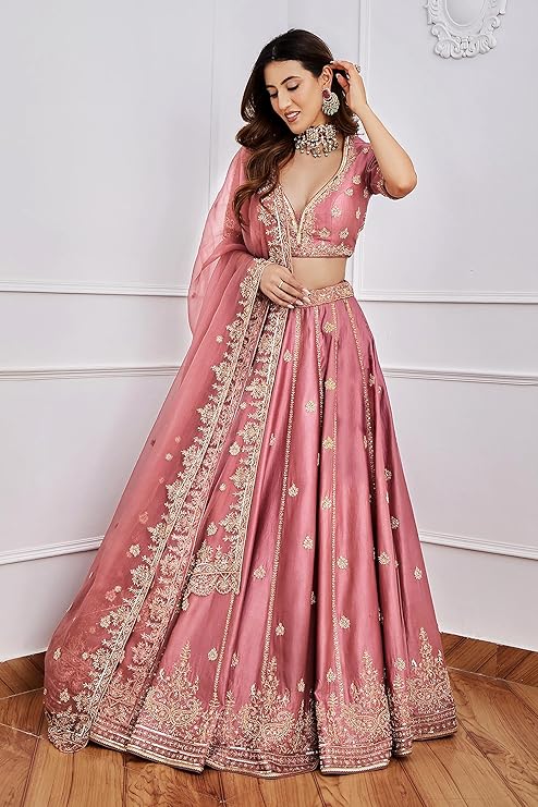 TRENDMALLS Women's Satin Embroidery Sequence Work Lehenga Choli Set with Dupatta For Women SemiS