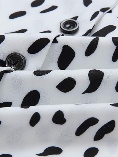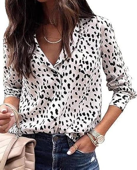 | [Material]: The business casual blouse made of Polyester, chiffon feeling fabric and no stretch; very soft and comfy, close to skin [Features]: Dalmation print shirt for women, casual v neck, long sleeve, button down, lapel collar, trendy leopard print / polka dot print / solid color, relaxed fit [Occasion]: Elegant work blouse, with stylish printed pattern, perfect for work, business, office, date, cocktail, club, wedding, holiday, shopping or daily casual wear [Style]: Casual, elegant and cute style, this fashion leopard print top can be worn with denim jeans, skinny pants, shorts, boots and heels in Summer/ Fall/ Winter/ Spring |