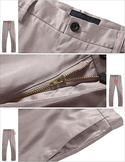 | 2 front slant pockets and 2 back welt button-down pockets Zip fly and button closure with belt loops Cool, comfortable and stylish, an ideal choice for work or casual wear Please refer to the detailed size chart on the left Note: Belt not included, please purchase separately |
