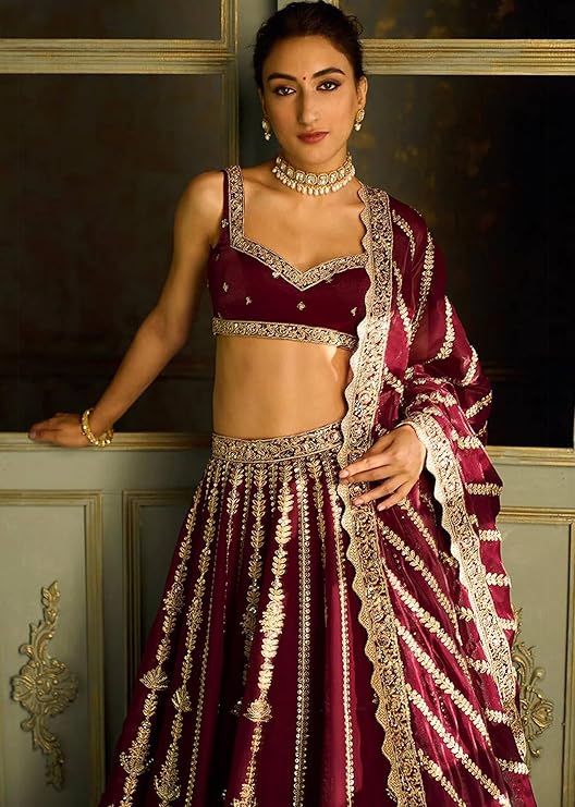 TRENDMALLS Women Art Silk Semi Stitched Embroidery With Golden Sequin Work Lehenga Choli With Dupatt